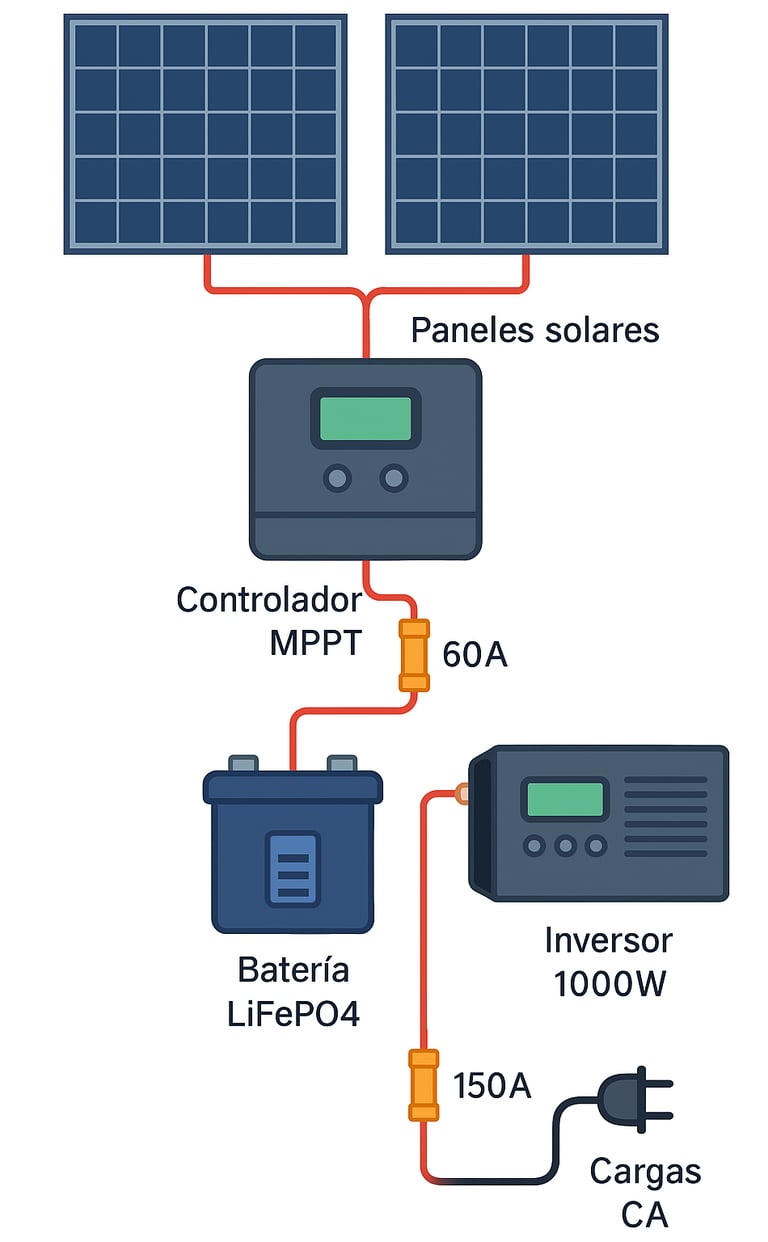 El diagrama muestra un sistema solar autónomo (off-grid) diseñado para transformar la energía del sol en electricidad utilizable para tus equipos y electrodomésticos.